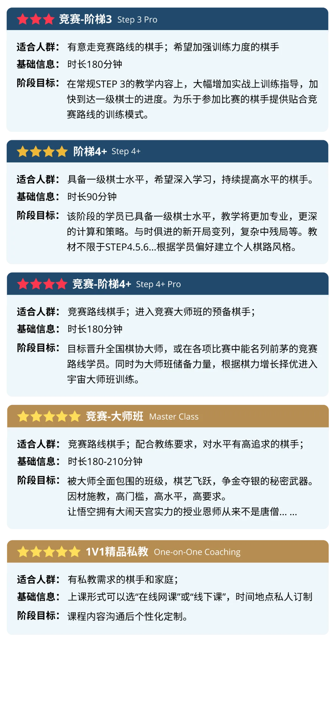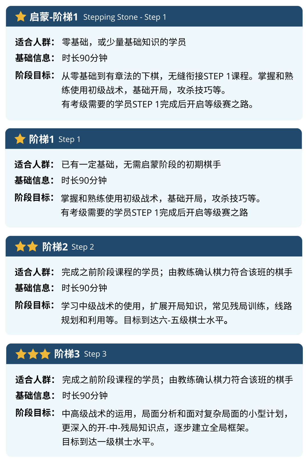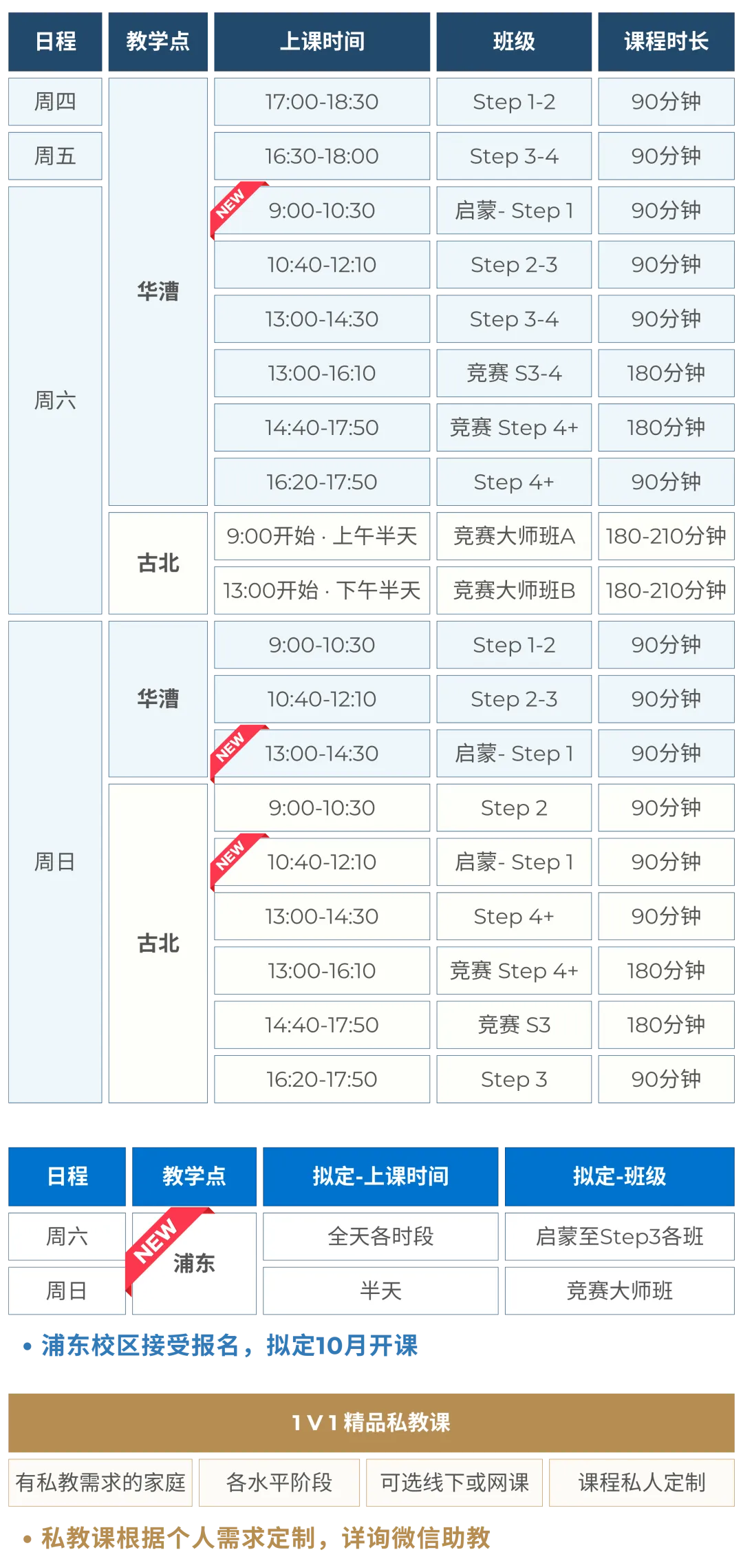 秋季课表中Step1-4个时段班级即日起至9月30日开放免费试听预约,9月后该班型试听课收取一节课学费。
